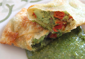 Finally, I have found a good appetizer to serve for the Super Bowl. These egg rolls surpass the standard chicken wings or nachos. Think of a very "chunky" form of guacamole stuffed in an egg roll wrapper and fried. That explanation alone qualifies it as a favorite with beer and definitely "man" food.