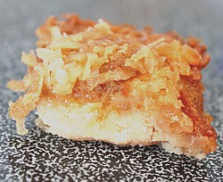 The recipe below is from a restaurant as requested by a reader of Bon Appetit. These coconut bars have a two luscious layers. The bottom is a buttery shortbread cookie and the top is layered with chewy coconut. The coconut layer is very close to German chocolate cake icing, somewhat thicker and without the pecans.