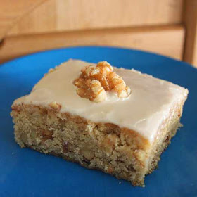 As far as this recipe, I am glad I found something a little bit upscale and unique in comparison to all the blondie and brownie recipes floating around out there. The moist maple and bourbon cake along with the crunchy toasted walnuts turned out to be a pretty tasty bar. The only change I made to the recipe was making 1/2 a batch more of the glaze. The original recipe amount left too much of the bar showing through, so it was not enough in my opinion.