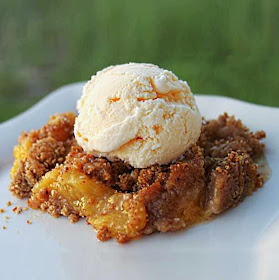 For the topping, set up a food processor with a metal blade in the bowl. Fill the bowl with all the topping ingredients except the butter cubes. Pulse the dry mixture until the almonds are in small bits with some larger chunks remaining. Drop in butter cubes and run the food processor until the ingredients can clump together in your hand. Sprinkle topping evenly over peaches and place pan in oven.