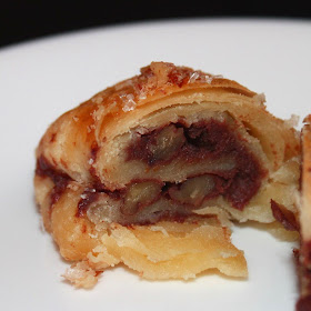 Even with all the time this recipe requires, the end result is well worth it. The various textures packed into this pastry are really wonderful on the palate. Imagine the buttery crunch of the outside layer of the pastry, then the smooth chocolate orange pastry cream and the crunch of nuts. Also, the inner flaky layers of the croissant are not to be overlooked. This recipe makes 32 pastries.