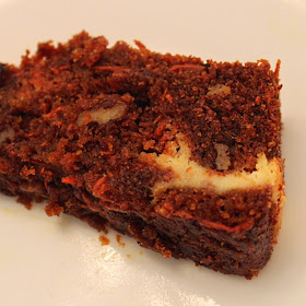 I did a little experimenting and tried to create a tunnel of cream cheese in the middle, pulling the filling recipe from another cake. As you can see that componet needs some more tweaking, for there was not enough there to balance with the cake part of this dessert. Due to the high liquidity of the batter, a repeat of this cake would cause me to choose a 9x13 inch cake with no filling that is topped with cream cheese frosting. However, I would still choose the honey/molasses over the brown sugar to sweeten the cake.
