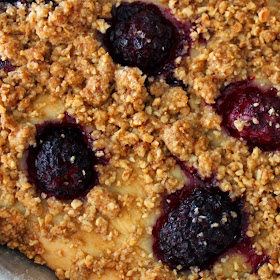 Uncover dough after 2nd rising and brush with some of the reserved almond/olive oil. Press blackberries into dough at 1 inch intervals. Lastly, sprinkle the streusel evenly over the surface. Cover again and place in a warm location and let rise its final and 3rd time until double. This should take about 30-35 minutes. While dough is rising, preheat the oven to 375 degrees.