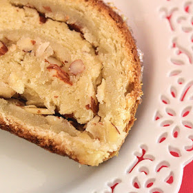 Divide marzipan into 2 pieces. Roll each piece into a rectangle measuring 5x8. Place each piece, side by side on top of the almond studded dough, leaving only a 1 inch border. Press down lightly to adhere. Start rolling the dough up, jelly roll style from the long end. Once completely rolled, the dough should be facing with the seam in the center of the bottom of the log. Pinch and tuck the ends under, downward like the bottom seam. Place log, seam side down on the baking sheet.