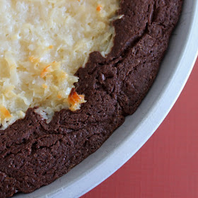 3. Due to the liquidity of the chocolate batter, smoothing out the coconut filling evenly can be difficult. To insure that the coconut layer is even, spoon it onto a sheet of wax paper and smooth it into an even 8 1/2 inch round. Then place it in the freezer until it becomes a solid mass. Remove and peel off wax paper and center on brownie batter and lightly press down. Since the coconut mixture is frozen, you will need to increase the baking time.