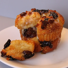 My taste testers were very pleased with the results. These jumbo muffins have the trademark of Monkey Bread with their caramel chewy coating of the brown sugar/butter mixture. In addition, you have the a subtle hit of almond in the dough. The almond does become more prominent when you taste the filling of almond paste which mingles deliciously with the amaretto spiked dried cherries.
