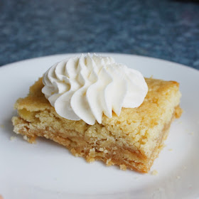 When you are ready to serve, remove the bars from the fridge and let set for 10 minutes. Then prepare the whipped cream topping by placing the whipping cream and sugar in a small bowl. Then add both extracts and beat until it reaches the thickness you need in order to decoratively pipe on top.