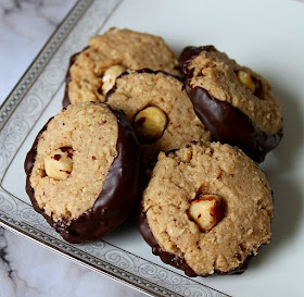 This particular version is a traditional German shortbread cookie. The recipe incorporates hazelnuts and dark chocolate. Quite a winning combination. The yield is about 2 dozen cookies and does not require much time.