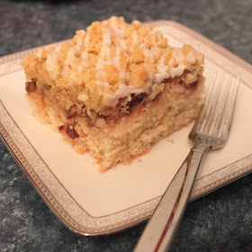 This particular recipe for coffee cake incorporates the flavor of penuche as a filling. It also has the particular add in as mentioned above. The filling in the cake is not as thick as fudge, it more resembles the texture of the typical icing you find on a German chocolate cake. The base of the cake is a fluffy yeast bread that just takes a few hours to rise. Outside of this delicious combination, the crowning touches are lots of streusel and a white icing drizzle.