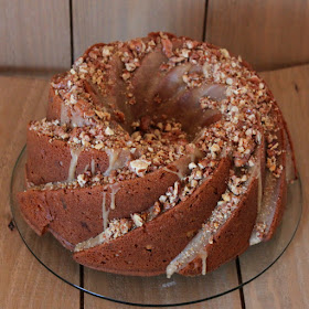 Divide the batter in half. Scoop one half of the batter into the prepared loaf pan. Sprinkle the cinnamon over the batter, reserving 3 tablespoons for the top of the loaf. Then carefully sprinkle the chopped walnuts over the cinnamon layer, making sure layer is even and covers the whole surface. Then scoop out the rest of the batter and smooth it over the walnut layer. Lastly, sprinkle with the reserved cinnamon sugar.