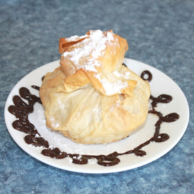 By now you are wondering what is in this phyllo package?! Simply put- it is pure, sinful indulgence. If you can imagine, think about crunching into these buttery flakes of phyllo and reaching a brownie-like chunk of cake packed with chocolate chips and walnuts. There you have it. For those without a vivid imagination.....