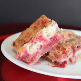 That is how this recipe came about.  It is very rich, having both white chocolate and cream cheese layers in it. Then to make it even better, it is filled with crushed canned strawberries and nuts.  Without the strawberries and nuts, the texture can best be described as a cross between white chocolate blondies and cheesecake.  The filling just adds another dimension of flavor.
