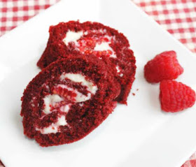 Then lift the aluminum covered cake log and place it, seam down, on a clean sheet of wax paper. Place on baking sheet and refrigerate for 30 minutes to an hour before serving. Lift out of foil and if using, sprinkle with powdered sugar. Cut into 1/2 inch thick slices and serve with raspberries on the side.