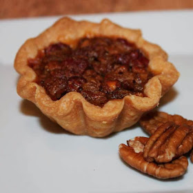 These little gems turned out to be less like a pecan pie than I thought they would. Instead of a nut topping with a filling, they were packed with pecans and the liquid filling baked up to be just enough to clump all the nuts together. Between the taste and the size, these tarts are perfect for any get together or afternoon snack. The recipe below makes 24 tarts, 2 1/2 inches in diameter.