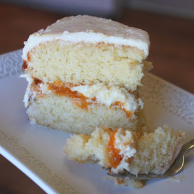Take out the chilled peach filling and smooth it over the top surface of the cake, being careful to leave a small border around the edge. Then carefully smooth the nutty filling over the peach filling. Stack the top layer on top. Cover with plastic wrap and chill for about 1 hour.