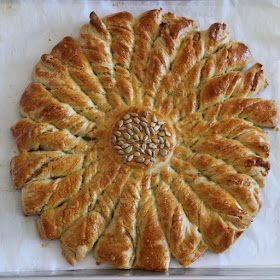 Take each portion of dough (there should be 24) by the outer tip and twist three times. Remove the glass and brush the surface with the egg yolk. Top the center circle of dough (as marked off with the drinking glass) with sunflower seeds.