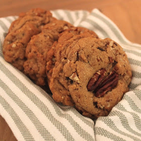 When you think of pecan cookies, pecan sandies and mexican wedding cookies come to mind. There is not much out there in a pecan variety of cookie. However, this recipe offers something distinctly different in the pecan cookie category. Instead of a soft shortbread type of cookie, these are thick, chewy and packed with pecans. Also, since the dough is scooped out into 1/3 cup size, they are big and shareable. This recipe makes 16 large cookies